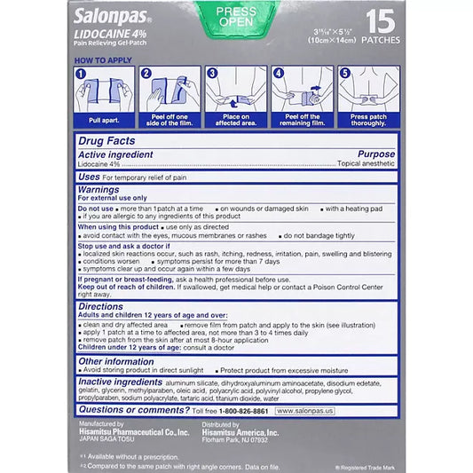 Salonpas Lidocaine Pain-Relieving Gel-Patch , 15 count