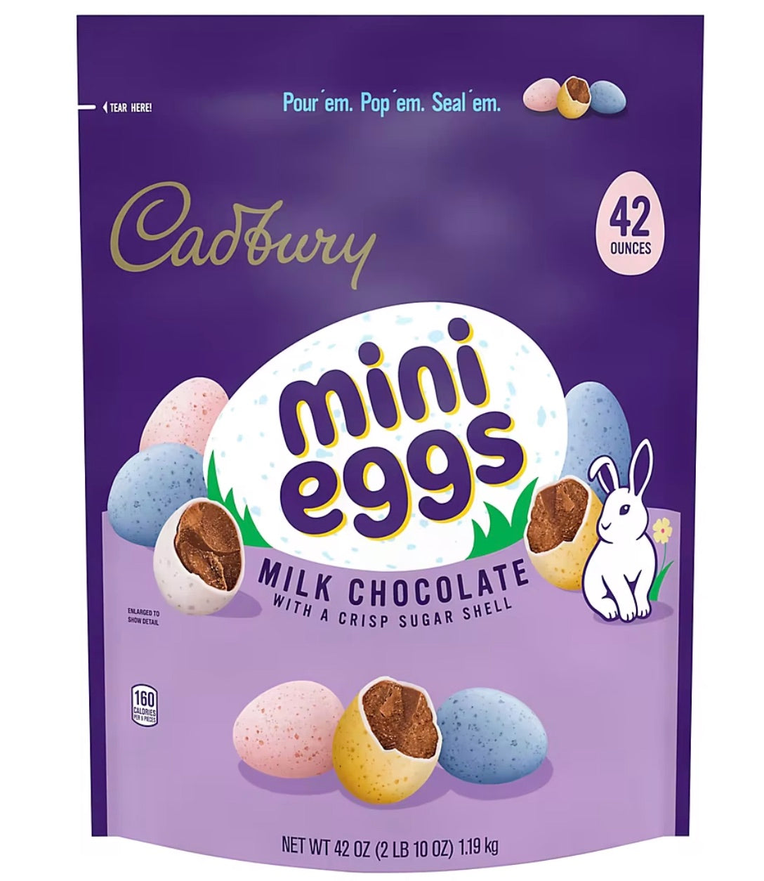 At this price point, I thought I was ordering the larger sized bags. I was planning on using these to fill/refill candy bowls, but given the smaller size bags, I will place them in individual Easter baskets. I think they are a little large for that, but at least they will be really appreciated by the recipients (each bag measures about 8" x 4"). Setting that aside, these candies are a huge hit at my house at Easter. The pastel colors and smooth, cruchy shells are really attractive. The insides are solid chocolate and taste delicious (not the white cream filling of the larger Cadbury eggs). I do love these eggs, but I would probably not order them here again,
