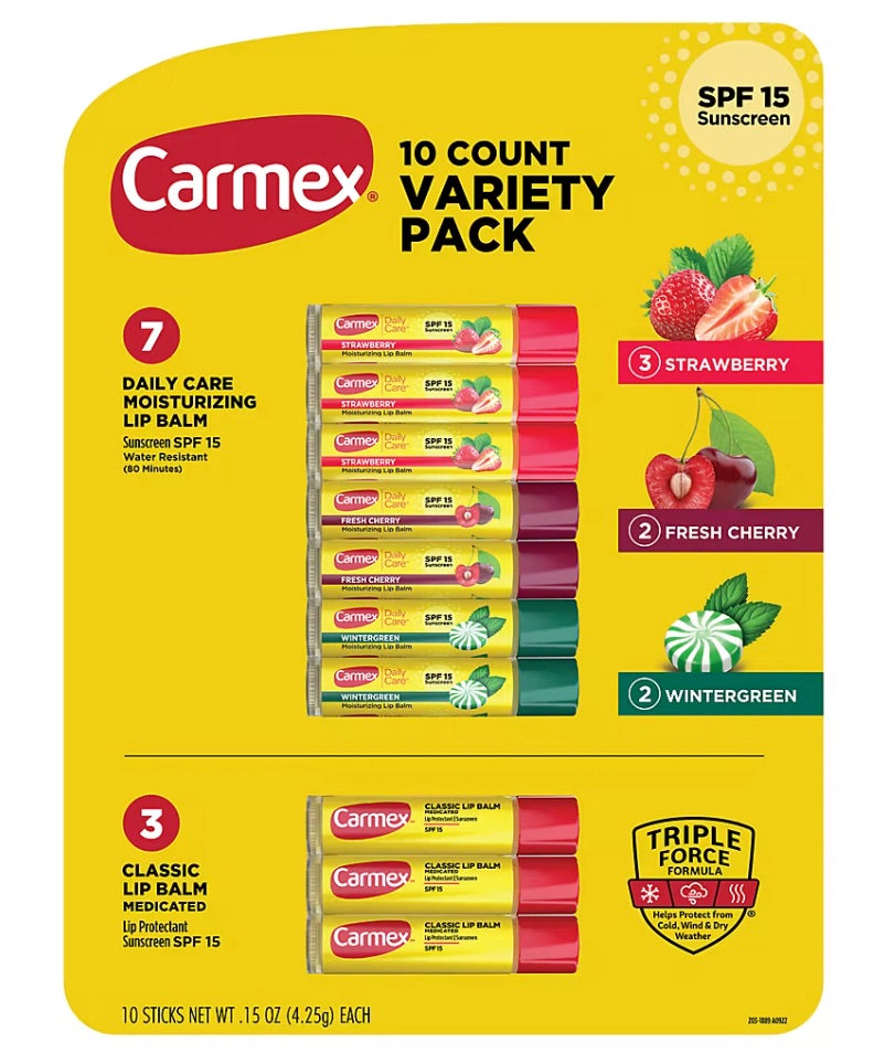 Help smooth, soothe and soften your lips with this Carmex Lip Balm Variety Pack. This 10-pack of moisturizing lip balms contains seven flavored Daily Care sticks and three Medicated Classic sticks. Daily Care moisturizing lip balm with SPF 15 helps provide protection against sunburn when applied as directed to keep your lips looking and feeling healthy. Water-resistant for up to 80 minutes, this lip balm stays put to keep your lips soft while you swim or stay active outdoors. This lip balm comes in three flavors, including strawberry, wintergreen and fresh cherry, so you can mix and match flavors to suit your mood each day. Classic lip balm is medicated and gives lips a cooling, soothing feeling while helping to protect lips from cold, wind and dry weather. Revive your lips with Carmex!