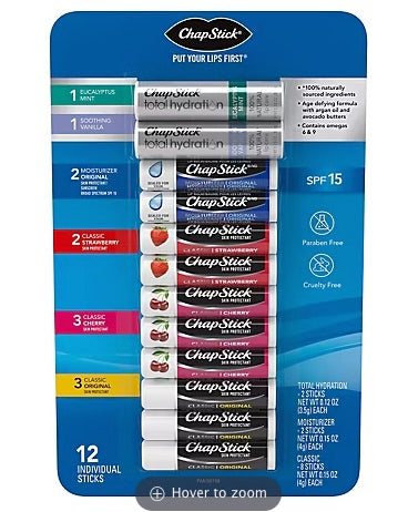 This ChapStick Variety Pack has 12 must-have lip balms to nourish, soften, hydrate and protect chapped lips. Including our Classic: Original, Cherry, Strawberry, Lip Moisturizer, Total Hydration Eucalyptus, and Total Hydration Soothing Vanilla. Provides you with much-needed lip healing and lip care that softens and moisturizes, leaving lips silky and smooth. Wherever you are take care of your lips by carrying a handy tube of ChapStick always with you. Tuck one in your purse, coat, desk drawer, and a car compartment, to keep trusted lip care within reach anytime you need it. The lip care experts for over 135 years... Apply this lip moisturizer as directed.