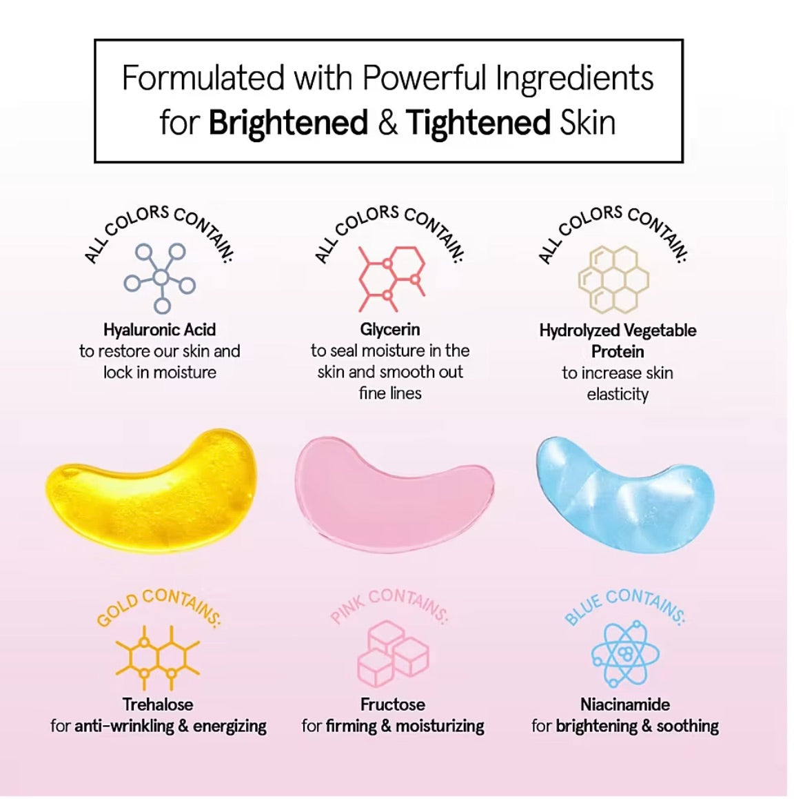 - Eight gold (energizing) under eye masks, eight pink (moisturizing) under eye masks, eight blue (illuminating) under eye masks