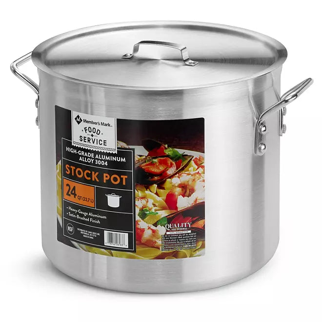 Member's Mark 24-Qt Covered Aluminum Stock Pot is great for making large batches of stew, soups, vegetables and seafood. It features a brushed satin finish and made of commercial-grade aluminum for quick and even heat distribution. The handles are attached with heavy-duty solid aluminum rivets for added support. This stock pot is NSF certified, compatible with gas, electric and ceramic glass cooktops and dishwasher-safe. It was designed and constructed for durability to withstand the rigors of a professional kitchen and easily adapt to home and non-commercial use. Lifetime Warranty.
