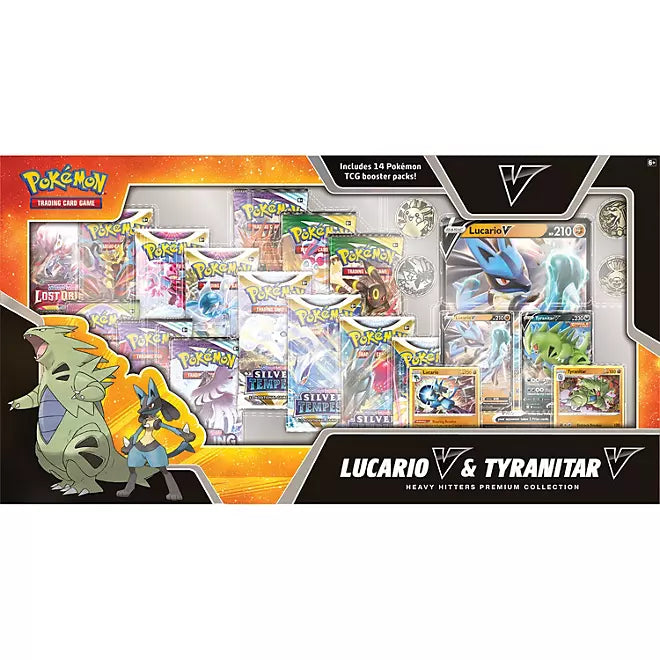 This pack includes four foil cards featuring Lucario V, Tyranitar V, Lucario, and Tyranitar, an oversize foil card featuring Lucario V, 14 Pokémon TCG booster packs, four large metallic coins, and a code card for Pokémon Trading Card Game Live.
