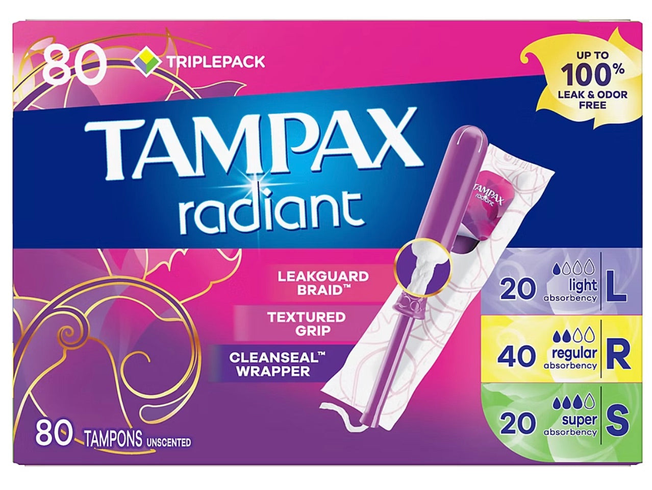 - Tampax Radiant tampons provide up to 100% leak and odor-free protection