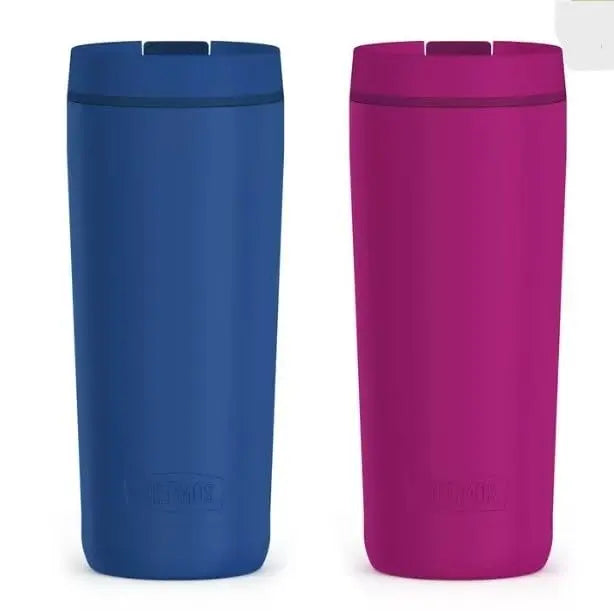 18oz Stainless Steel Travel Tumblers from Thermos Brand are the perfect size for your morning wake up call. Constructed of high quality stainless steel, these tumblers are durable and feature Thermos vacuum insulation technology. Made with minimal parts that are dishwasher safe and easy to clean. Just top it off and you’re ready to take on the day. Includes: (2) 18oz Thermos brand stainless steel tumblers Features: Thermos vacuum insulation technology Keeps beverages hot for 5 hours or cold for 14 hours Stainless steel construction Top rack dishwasher safe The slide lock lid helps prevent spills and leaks. Sweat-proof exterior Cup holder compatible Easy to clean cap design